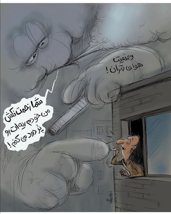 درهفته هاگذشته افزایش غلظت آلاینده های جوی درتهران راداشتیم که این پدیده مشکلاتی رابرای سلامت زندگی مردم به دنبال دارد مشکلات تنفسی برای انسان وسایر موجوداتی که دراین محیط زیست زندگی می کنند این سوژه درکارهای متعددی ازکاریکاتوریستها به تصویر کشیده شد که نظرتان رابه آن جلب می کنم.