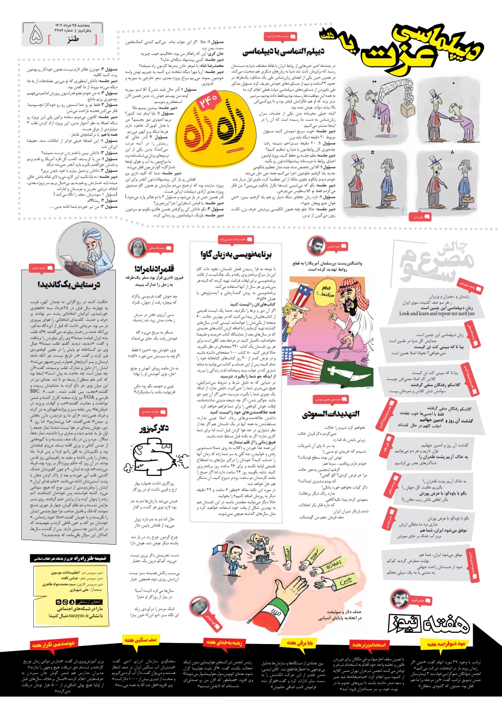 دویست و چهلمین شماره ضمیمه هفتگی طنز راه راه در روزنامه وطن امروز، صبح امروز –۲۵ خرداد– منتشر شد.در این شماره از راه راه فعالیتهای ایران در عرصههای بینالملل و همچنین موضوعات روز را زیر ذرهبین بردهایم. طنزها و اشعار و کاریکاتورهای راه راه را از دست ندید.