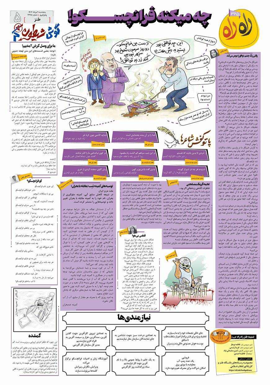 سیصد و بیست و پنجمین شماره ضمیمه هفتگی طنز راهراه در روزنامه وطن امروز، صبح امروز -۹مرداد- منتشر شد. در این شماره از راهراه، ماجرای فرانچسکو و مذاکره و موضوعات روز را زیر ذرهبین بردهایم. طنزها، اشعار و کاریکاتورهای راهراه را از دست ندهید.