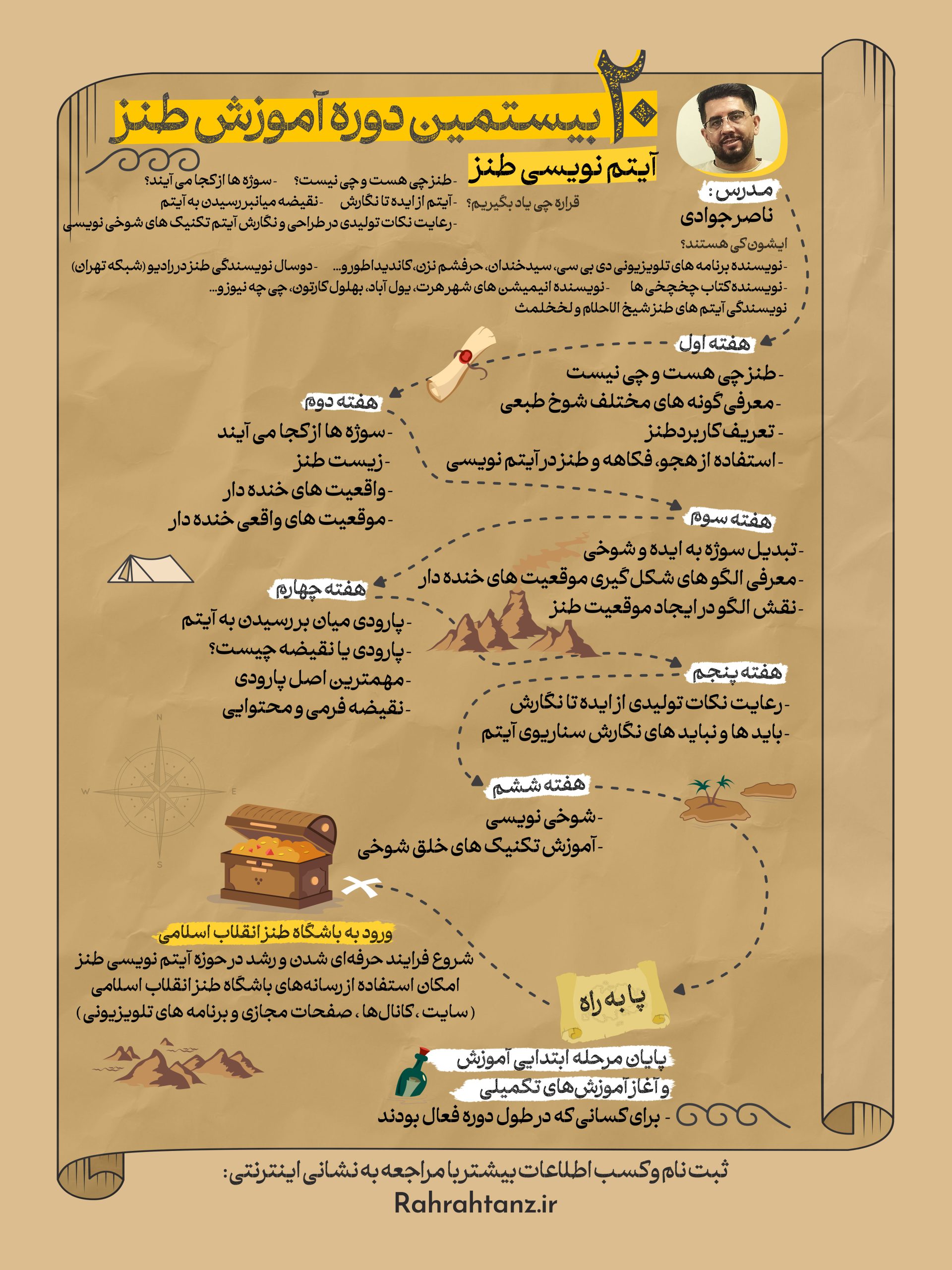 بیستمین دوره آموزشی باشگاه طنز انقلاب اسلامی فرصتی استثنایی برای کشف و پرورش استعدادهای طنزپردازی در حوزه‌های متنوع است. این دوره با حضور اساتید برجسته طراحی شده و هدف آن تربیت نسلی توانمند و متعهد از طنزپردازان در سطح کشور است. در کلاس‌های این دوره، شرکت‌کنندگان به صورت تعاملی و عملی با اصول و تکنیک‌های مختلف طنزنویسی آشنا می‌شوند و مسیر حرفه‌ای شدن در دنیای طنز را آغاز می‌کنند.