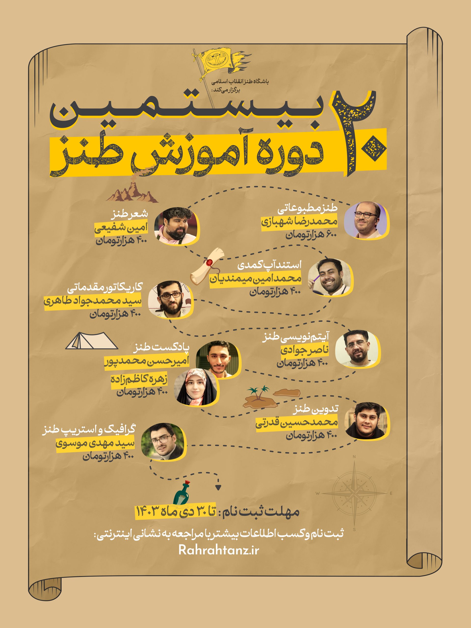 علاقه‌مندان می‌توانند برای ثبت‌نام از این لینک بیستمین دوره آموزشی باشگاه طنز انقلاب اسلامی استفاده کنند. هزینه ثبت نام در این کلاس فقط ۴۰۰ هزار تومان است که در ابتدای کلاس دریافت خواهد شد.