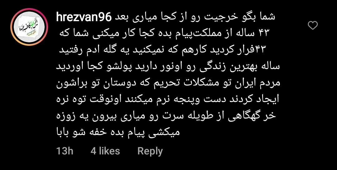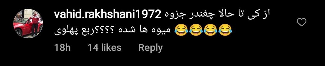 محدثه مطهری/ طنزپردازی شغل دوم ایرانیهاست و همه ایرانیها شیفت عصر طنزپردازن! یعنی هرکسی اراده کند کلی نمک و مزه از او میریزد. شبکههای اجتماعی هم این روزها جای خوبیست برای کشف بروز و ظهور این استعداد در قالب پست و استوری و کامنت و… . در سری مطالب «طنز شیفت عصر» این نمکپاشی در بخش کامنتهای یک پست را منتشر میکنیم.