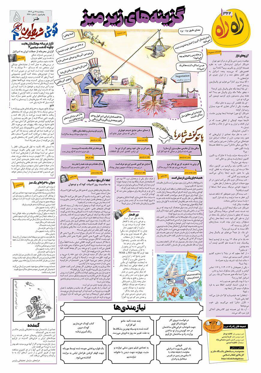 سیصد و بیست و دومین شماره ضمیمه هفتگی طنز راهراه در روزنامه وطن امروز، صبح امروز -۱۹تیر- منتشر شد. در این شماره از راهراه، گزینه های زیر میز مذاکره و موضوعات روز را زیر ذرهبین بردهایم. طنزها، اشعار و کاریکاتورهای راهراه را از دست ندهید