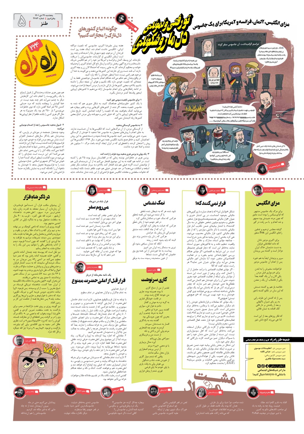 دویست و بیست و چهارمین شماره ضمیمه هفتگی طنز راه راه در روزنامه وطن امروز، صبح امروز –۲۹ دی– منتشر شد.در این شماره از راه راه عزای انگلیس، آلمان، فرانسه و آمریکا برای یک جاسوس و همچنین موضوعات روز را زیر ذره بین برده ایم. طنزها و اشعار و کاریکاتورهای راه راه را از دست ندید.