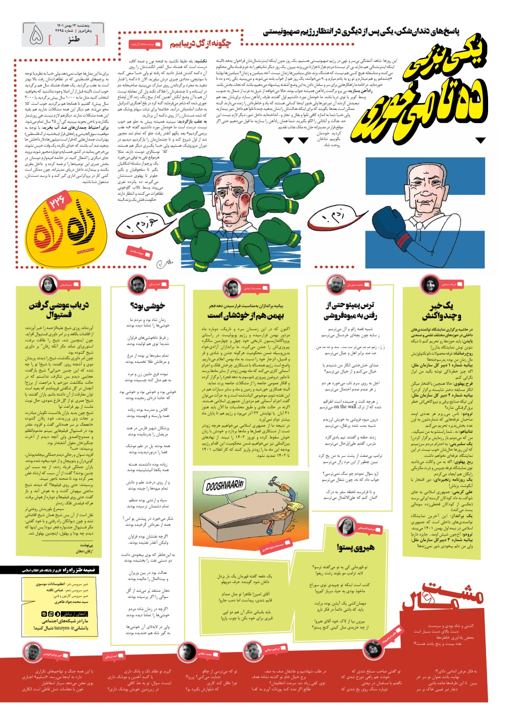 دویست و بیست و ششمین شماره ضمیمه هفتگی طنز راه راه در روزنامه وطن امروز، صبح امروز –۱۳ بهمن– منتشر شد.در این شماره از راه راه وضعیت صهیونیستها در برابر حملات شهادتطلبانه فلسطینیها و همچنین موضوعات روز را زیر ذره بین بردهایم. طنزها و اشعار و کاریکاتورهای راه راه را از دست ندید.