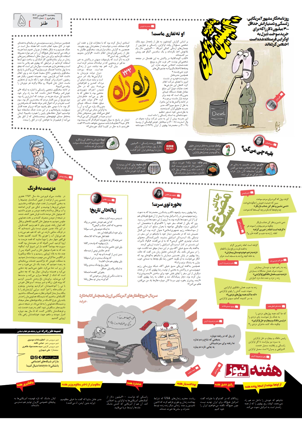 در این شماره از راه ‌راه اختلاس زلنسکی و همچنین موضوعات روز را زیر ذره‌بین برده‌ایم. طنزها و اشعار و کاریکاتورهای راه ‌راه را از دست ندید.