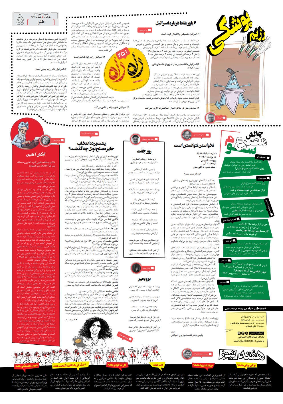 در این شماره از راه راه، اسرائیل و همچنین موضوعات روز را زیر ذرهبین بردهایم. طنزها و اشعار و کاریکاتورهای راه راه را از دست ندید.