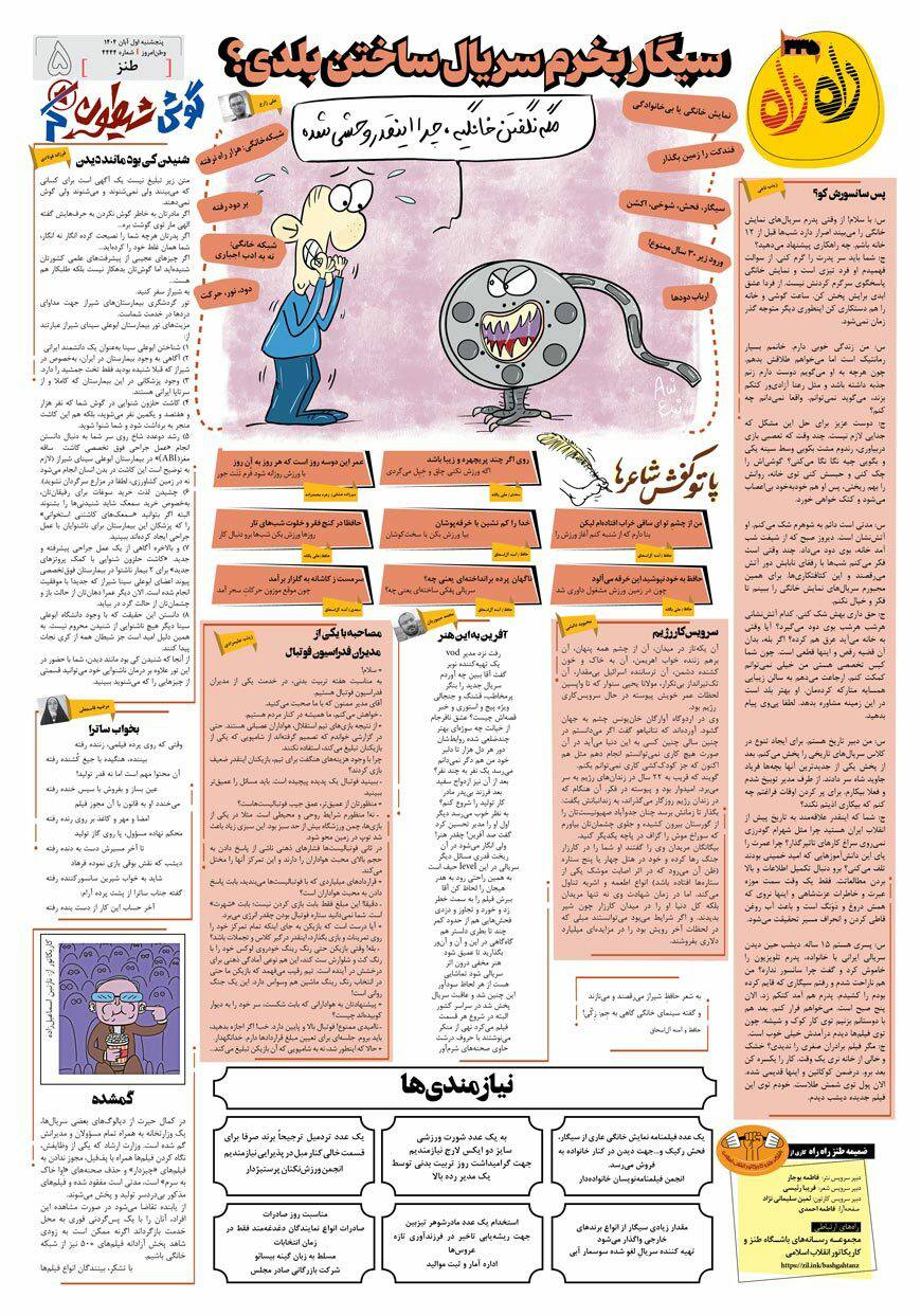 سیصد و سی و پنجمین شماره ضمیمه هفتگی طنز راهراه در روزنامه وطن امروز، صبح امروز -۱آبان- منتشر شد. در این شماره از راهراه، وضعیت سینما و شبکه نمایش خانگی و موضوعات روز را زیر ذرهبین بردهایم. طنزها، اشعار و کاریکاتورهای راهراه را از دست ندهید.