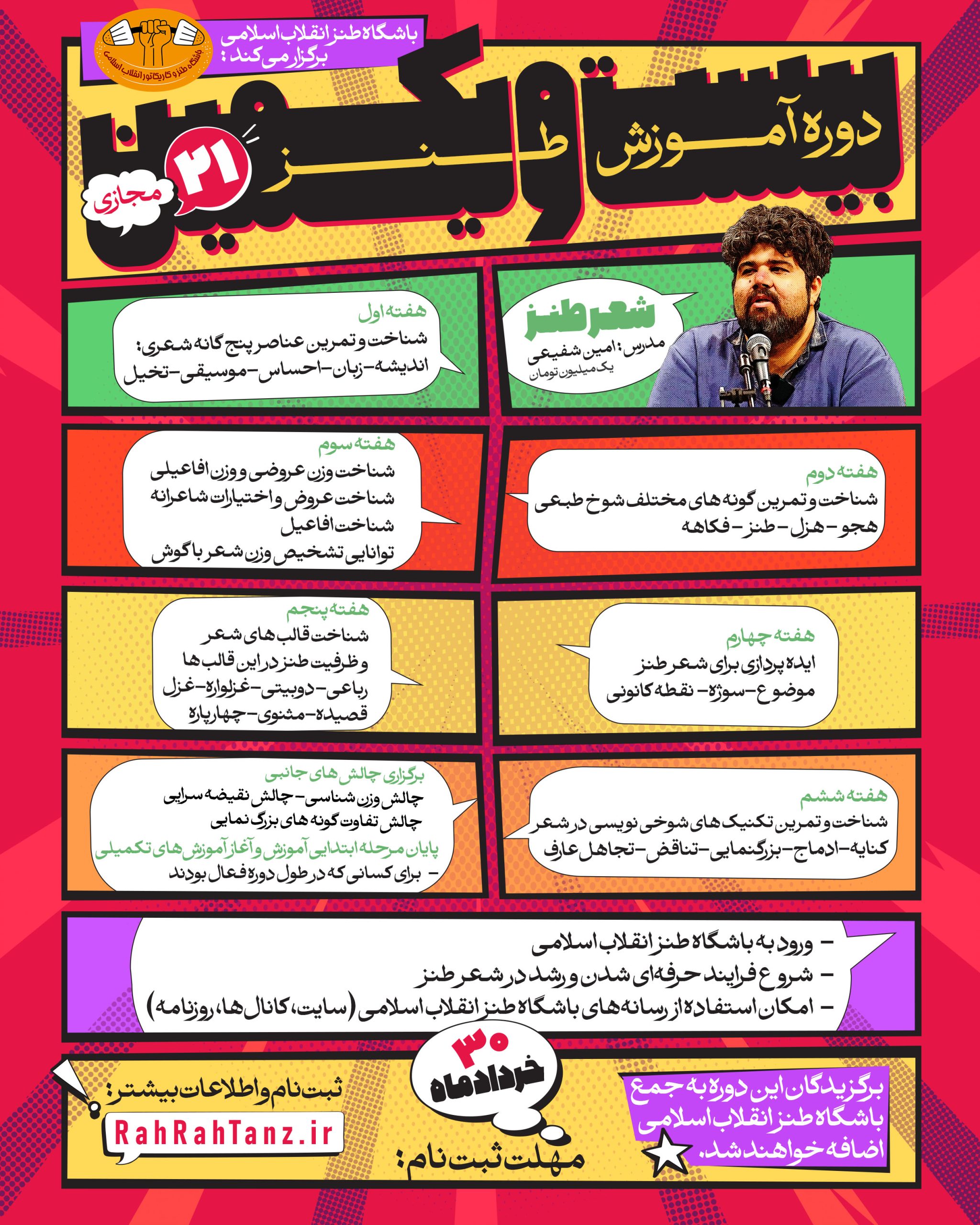 بیست و یکمین دوره آموزشی باشگاه طنز انقلاب اسلامی فرصتی استثنایی برای کشف و پرورش استعدادهای طنزپردازی در حوزههای متنوع است. این دوره با حضور اساتید برجسته طراحی شده و هدف آن تربیت نسلی توانمند و متعهد از طنزپردازان در سطح کشور است. در کلاسهای این دوره، شرکتکنندگان به صورت تعاملی و عملی با اصول و تکنیکهای مختلف طنزنویسی آشنا میشوند و مسیر حرفهای شدن در دنیای طنز را آغاز میکنند.